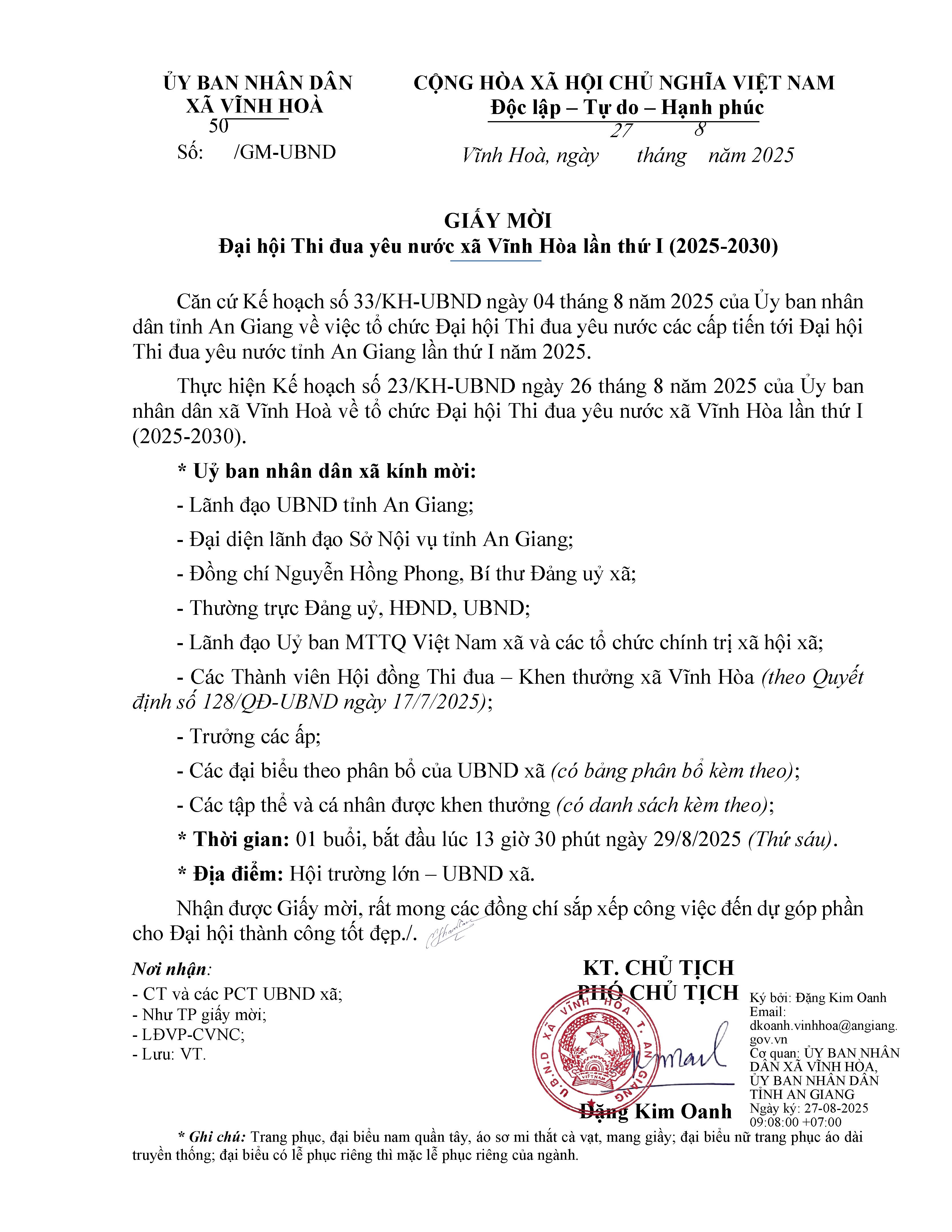 GIẤY MỜI Tham dự Đại hội thi đua yêu nước xã Vĩnh Hòa lần thứ I, giai đoạn 2025-2030!